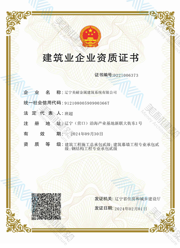遼寧美耐金屬建筑系統(tǒng)有限公司位于遼寧(營口)沿海產(chǎn)業(yè)基地,專注于預制金屬建筑系統(tǒng)領域,是一家集工業(yè)建筑設計、制作、施工及相關的技術咨詢與服務為一體的綜合性服務企業(yè)。作為國家鋼結(jié)構(gòu)協(xié)會會員、中國建筑金屬結(jié)構(gòu)協(xié)會會員單位與國家高新技術企業(yè),美耐建筑集建筑工程施工總承包、鋼結(jié)構(gòu)工程專業(yè)承包等多種資質(zhì)于一身,并擁有22項鋼結(jié)構(gòu)建筑領域?qū)@?項軟件著作權。